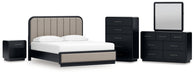 Rowanbeck California King Upholstered Panel Bed, Dresser, Mirror, Chest and Nightstand