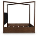 Casual contemporary styling with a decidedly modern vibe. Bathed in a rich dark brown finish, this queen canopy bed is warm and inviting. Its integrated “X” canopy and full wrap-around rails set to the floor adorn your restful retreat with on-trend elegance. Dual USB charging on both sides of the upholstered headboard is a subtly cool way to keep your electronics at the ready. What a simply stunning way to achieve the bedroom of your dreams.
