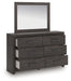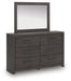 Details Includes dresser and mirror, Made with engineered wood (MDF/particleboard/plywood) and decorative laminate for the right balance of affordability and durability, Dark charcoal finish over replicated oak grain, Decorative laminate replicates natural or man-made material surfaces with consistent color, pattern and texture, Large handles with black finish, 6 smooth-gliding drawers, Framed front and pilasters, Mirror attaches to back of dresser; can also be mounted on wall horizontally or vertically , Safety is a top priority, clothing storage units are designed to meet the most current standard for stability, ASTM F 2057 (ASTM International), Drawers extend out to accommodate maximum access to drawer interior while maintaining safety, Minor assembly required