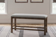 This counter height upholstered bench might be simple at first sight, but a closer look reveals beauty in the details. With a distressed nutmeg finish, antiqued nailhead trim and textured polyester upholstery, it's beaming with charm. Cushioned seat ensures long, lingering meals are enjoyed in total comfort.