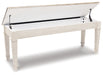 This bench invites you to strike a note for small space living. An inspired choice for coastal chic or modern farmhouse settings, this piano style bench with under seat storage sports a grayish white finish with rub through effect for timeworn appeal.
