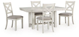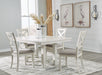 | Details | D642-01: Made with solid wood frame, Antiqued white finish with grain texture, Light gray polyester upholstery, Nailhead trim, X-back, Assembly required, D642-45: Made with rubberwood solids, ash veneer and MDF substrates, Antiqued white finish with grain texture, Tabletop with planked effect, Two 12" removable center leaves, Table extends to 86" overall by pulling both ends and dropping in leaves, Seats up to 8, Assembly required, | |