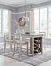 This counter height table with storage invites you to raise the bar on small space living. An inspired choice for coastal chic or modern farmhouse settings, this clean-lined, simply striking table doubles the charm with a brown tone top with plank effect, paired with a grayish white base with rub through effect for timeworn appeal. Built-in 8-bottle wine rack and pair of open shelves make the most of every inch of space.
