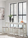 | Details | Includes counter height dining table and 3 counter height bar stools, Table made with hardwood solids, ash veneer and MDF substrates, Stools made with sturdy solid wood frame, Antiqued white finish with grain textures, Polyester upholstery, Foam cushioned seat, Nailhead accents, Table includes 110V power supply with dual USB-A/USB-C charging ports, Power cord included; UL listed, Assembly required | |
