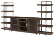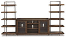 Details Includes TV stand and 2 etagere-style piers, Made of acacia veneers, wood, engineered wood and metal, Oiled walnut-tone finish, Dark bronze-tone metal hardware, TV stand with 2 glass-front cabinets, each with an adjustable shelf, adjustable/removable center shelf, open cubby and cutouts for wire management, Pair of metal-frame piers, each with 5 fixed shelves, Compatible with W100-02 and W100-101 electric fireplace inserts (sold separately), Assembly required