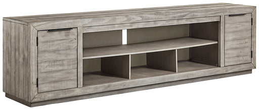 Signature Design by Ashley®Set your sights on modern farmhouse style with this XL TV stand. Distressed two-tone treatment blends a weathered gray with vintage white for an ut...