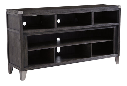 Signature Design by Ashley®Make watching TV a joy. This TV stand's rustic-industrial style—with a gray finish, squared edges, zinc-tone corner bracket accents and nailhead de...