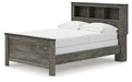 Cool, casual style is for all ages. With this full bookcase panel bed, they get the function they need plus the refined design you love. Approachably neutral in a rustic warm gray, it’s adaptable enough to pair with an assortment of existing colors and room decor. Faux metal detailing with nailhead accents lends an industrial edge. And handy storage cubbies in the headboard keep books, toys and other bedtime necessities within easy reach.