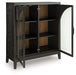 If your love of entertaining is only surpassed by your love of sleek, versatile style, this bar cabinet expertly suits your needs. Racks for wine bottles and glasses neatly store necessities for a pour of vino. Adjustable shelves comfortably hold additional bottles, dishware or drink-making accessories. For added flexibility, the cabinet's black and natural brown finishes effortlessly pair with your home’s existing aesthetic. Doors with softly curved glass inserts allow this chic piece to double as a display space.