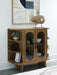 This accent cabinet puts a uniquely chic spin on a classic storage solution. It seamlessly blends clean lines with mid-century inspired curves, donning a light brown finish for that much more versatility. Exposed side shelves eagerly welcome your favorite decorative pieces, while additional shelves behind the glass-paneled doors offer ample storage.