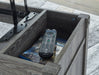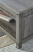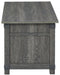 Details Made of metal and engineered wood, Gray decorative wood grain laminate, Metal crossbuck accents, Lift top design; hidden storage under lid, Fixed lower shelf, Assembly required