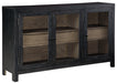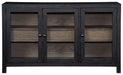 Details Made with wood, oak veneer and engineered wood, Black finish outside; warm gray finish inside, 3 glass panel door fronts, Metal knobs with black finish, 2 storage drawers, Assembly required