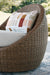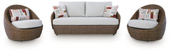 Poolside comfort and style have never been so chic. With this outdoor loveseat and swivel chairs set, lounging alfresco is effortlessly cool. The woven resin wicker combines intricate beauty with a dose of durability. High-performing fabric helps to keep pillows and cushions looking fresh over time. And with the swivel chairs' rounded silhouettes, luxe outdoor living is within easy reach.