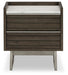Clean lines lend sophistication and structure to this nightstand. Its complex rich grayish brown finish contrasts perfectly with a white marble top, while the streamlined silhouette features overlay slats to create visual interest. A metal base and bar pulls in a low-sheen steel finish add to this piece's contemporary vibe.