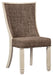 The beauty of this upholstered dining chair is something to savor. Contoured seat cradles you in cushioned comfort while lattice peekaboo detail on the back makes this a striking chair from all angles. Heavy woven fabric adds textural interest that complements the chair’s antiqued white finish.