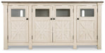 | Details | Made of veneers, wood and engineered wood, Two-tone finish (weathered oak top over antiqued white), 2 side cabinets with 2 adjustable shelves each, 1 center cabinet with 2 doors and 2 adjustable shelves, Cabinet doors with glass inlays, Black faceted hardware, Cutouts for wire management | |