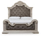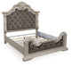 Inspired by the grandeur and grace of European traditional style, this opulent California king upholstered panel bed is nothing short of stunning. Ornate sculptural details and button-tufted fabric on the impressive headboard and footboard are sure to make a sophisticated statement in your restful retreat. A timeless antiqued white coloration lends an air of subtle elegance to this sumptuous bed.