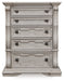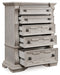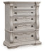 Details Made with hardwood solids, oak and ash swirl veneers, MDF substrates and cast resin components, Antiqued white finish, Hardware with antiqued bronze-tone finish, 5 smooth-gliding drawers with fully finished interiors, English dovetail construction and heavy-duty ball-bearing side glides (top drawer felt lined)