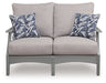 This outdoor loveseat prioritizes versatile style and comfort, all while providing the durability you need alfresco. Crafted with a sturdy wood-look material in gray, it withstands the elements with ease. Cleanable and UV-resistant Nuvella® fabric rounds out the piece with added function.