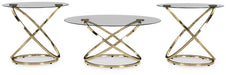 | Details | Includes coffee table and 2 end tables, Made with metal and glass, Champagne goldtone finish, Clear tempered glass tabletop, Assembly required | |