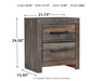 | Details | Made of engineered wood (MDF/particleboard) and decorative laminate, Brown rustic finish with burnt orange and teal accents in a replicated wood grain with authentic touch, 2 smooth-gliding drawers, Drawer interiors are lined with a faux linen laminate for a clean, finished look, Large-scale hardware with dark finish, 2 slim-profile USB-C charging stations, Power cord included; UL Listed, Small Space Solution | |