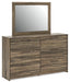 Casually cool style and lots of storage go hand in hand with this dresser and mirror. A weathered brown finish over replicated oak grain creates an easygoing vibe, setting the scene in your restful retreat. Clean lines and modern handles provide a fuss-free look. And the dresser's six roomy drawers give you plenty of space for stowing away clothes and more.