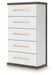 Looking to make a subtly striking statement in your bedroom? We've got you covered. This chest of drawers' sophisticated two-tone treatment marries a warm brown finish over replicated walnut grain with a matte white finish. Rounded corners and a thick top radiate an air of modern panache, while sleek handles in a champagne finish add a sparkling touch to the spacious drawers. It’s a master class in contemporary yet comfortable character.