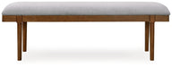 A refreshed take on retro aesthetics. This upholstered bench adds an air of simplicity to your dining space, capturing the architectural language of mid-century stylings. Its seat invites the eye with a soft-edged silhouette and neutral gray cushion. A casual, yet timeless, finish on the frame creates visual contrast to complete this study in form and function.