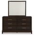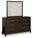 | Details | Includes dresser and mirror, Made with hardwood solids, engineered wood and MDF substrates, Grayish brown wood-tone finish, Metal bar pulls with satin nickel-tone finish, 6 smooth-gliding drawers with dovetail construction and heavy duty ball-bearing side glides (top drawers felt lined), Mirror attaches to back of dresser | |