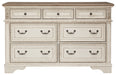 Elevating the art of traditional cottage styling, this dresser is your dream bedroom retreat realized. Its antiqued two-tone aesthetic blends a chipped white with a distressed wood finished top for added charm. Framed drawer fronts and decorative corbels add refinement, while bail pulls in a dark bronze-tone finish lend a classic touch.