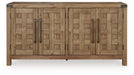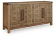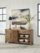 Rustic character with a dash of refinement. Outfitted with stunning hickory veneer and completed with a natural finish, this dining server celebrates the authentic beauty of wood. Its sturdy silhouette lends a substantial, luxurious weight to the look. Spacious cabinets with shelving and drawers neatly tuck away entertaining essentials. Loaded with charm, this server completes your dining space with modern farmhouse flair.