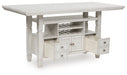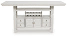 | Details | Includes dining table top and base, Made with rubberwood solids, ash veneer and MDF substrates, Antiqued white finish with wood grain texture, Two 10-bottle wine storage shelves (1 reversible), Lower door cabinet accessible from both sides, 2 pass-through drawer bins, Assembly required | |