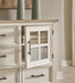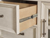 | Details | Includes dresser and mirror, Made with hardwood solids, veneers and MDF substrates, Two-tone finish (antiqued white and light gray wood tone), Dark bronze-tone bar pulls, 2 glass-front cabinets, each with single storage shelf, 5 drawers with fully finished interior, dovetail construction and heavy duty ball-bearing side glides (top drawer felt lined), Mirror attaches to back of dresser | |