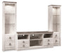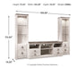 | Details | Includes 3 pieces: TV stand and 2 piers, Made with engineered wood (MDF/particleboard) and decorative laminate, Replicated whitewash and wood grained block pattern with authentic touch, Antiqued brass-tone ring-pull hardware, 2 drawers, 2 media cubbies, cutouts for wire management and removable center shelf, Piers with LED lighting, 4 adjustable glass shelves and 2 cabinets, each with an adjustable shelf; cabinet doors open to the left, Assembly required | |