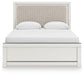 | Details | Includes upholstered panel headboard, panel footboard, platform rails and roll slats , Made with engineered wood (MDF/particleboard/plywood) and decorative laminate for the right balance of affordability and durability , Matte white finish with subtle replicated wood grain , Decorative laminate replicates natural or man-made material surfaces with consistent color, pattern and texture , Polyester upholstery , Chrome-tone and glitter accents, Bed does not require additional foundation/box spring; accommodates most zero clearance adjustable bases , Mattress available, sold separately, Minor assembly required | |